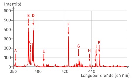 Dans ces conditions, les atomes et les ions éjectés sont alors dans des niveaux d’énergie excités. En se désexcitant, ils émettent un rayonnement qui est analysé par spectroscopie entre 250 et 900 nm. On obtient ainsi un spectre d’émission atomique. La détermination des longueurs d’onde de raies présentes sur ce spectre permet d’identifier les atomes ou ions présents dans la cible.
